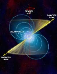 Un púlsar es una estrella de neutrones que emite radiación periódica a intervalos regulares, como un reloj. La frecuencia depende del periodo de rotación de la estrella y varía generalmente entre pocos milisegundos a uno o dos segundos. Las estrellas de neutrones se producen después de la explosión de una estrella como una supernova. Los restos que quedan tras la explosión pueden derivar en una estrella de protones, que generalmente tiene un radio de entre 10 y 20 kilómetros y gira a gran velocidad.